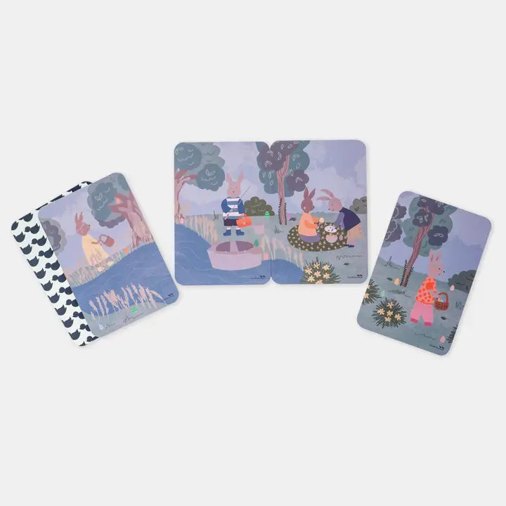 27 cards in this pack Test your memory, speed and visual skill playing against your friends and family with these hoppy Easter cards in a game of snap or memory. Try lining them up to make the picture puzzle or create your very own story. Each card is printed on environmentally friendly paper, laminated and features rounded corners for long life and durability. There are 26 cards with 13 different designs and 1 instruction card.