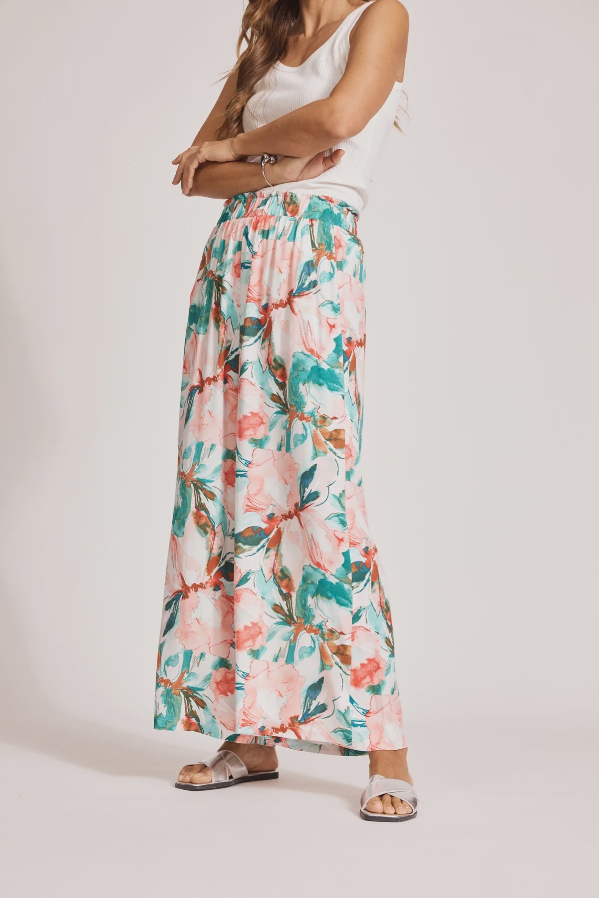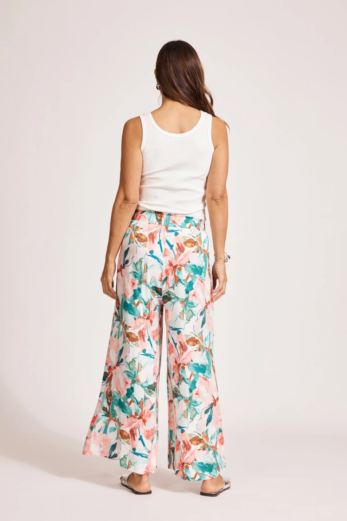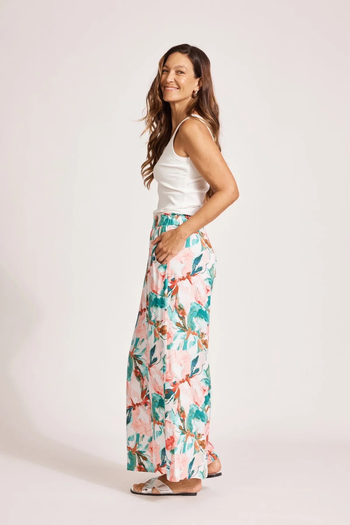 A flowing palazzo pant for elevated ease. Crafted from soft, draped fabric. Features a pull-on elasticated waistband, functional pockets, and wide full-length leg.