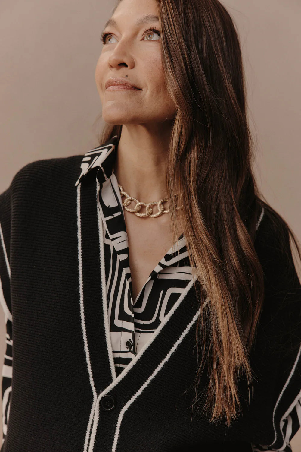 Meet your new vest friend. Perfect for layering, the Avino Knit Vest will transform your cool-weather wardrobe. With a sleek, modern silhouette, this distinctive piece features a deep V-neck, a button-through front, and striking contrast detailing that adds intrigue to the design. The buttoned vents on each side let you adjust the fit, creating a tailored shape that complements whatever you layer beneath.
