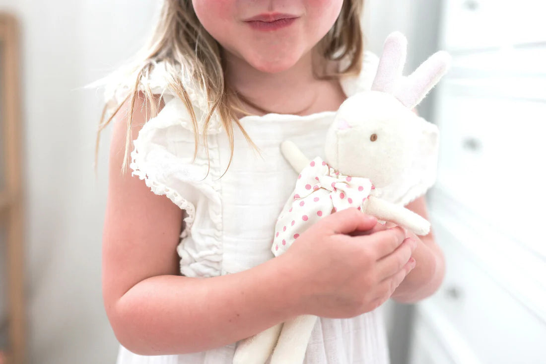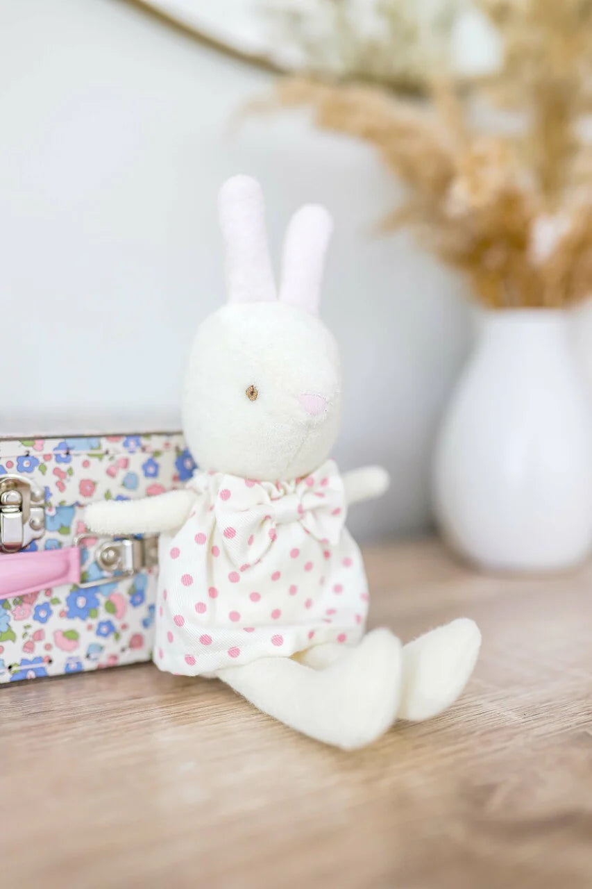 Baby Betsy Bunny is possibly the cutest little bunny you ever did see. Made from a soft terry towelling fabric and wearing a cute tiny dress, she makes the sweetest little bunny companion for your little one.