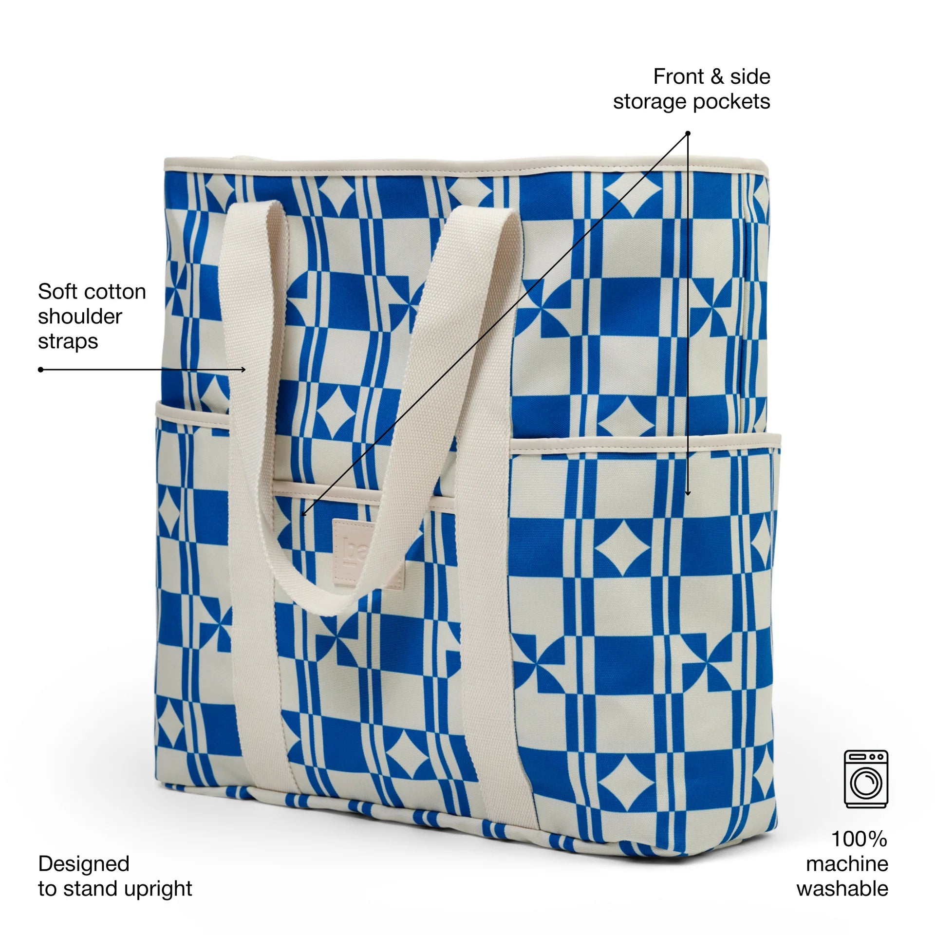 Crafted from durable printed water-resistant fabric to withstand all your summertime adventures. Premium lining keeps your belongings safe and sand-free. The internal pocket and outside pockets keep belongings organised and accessible. Soft cotton over-shoulder straps offer comfortable carrying from pool to beach to cabana.