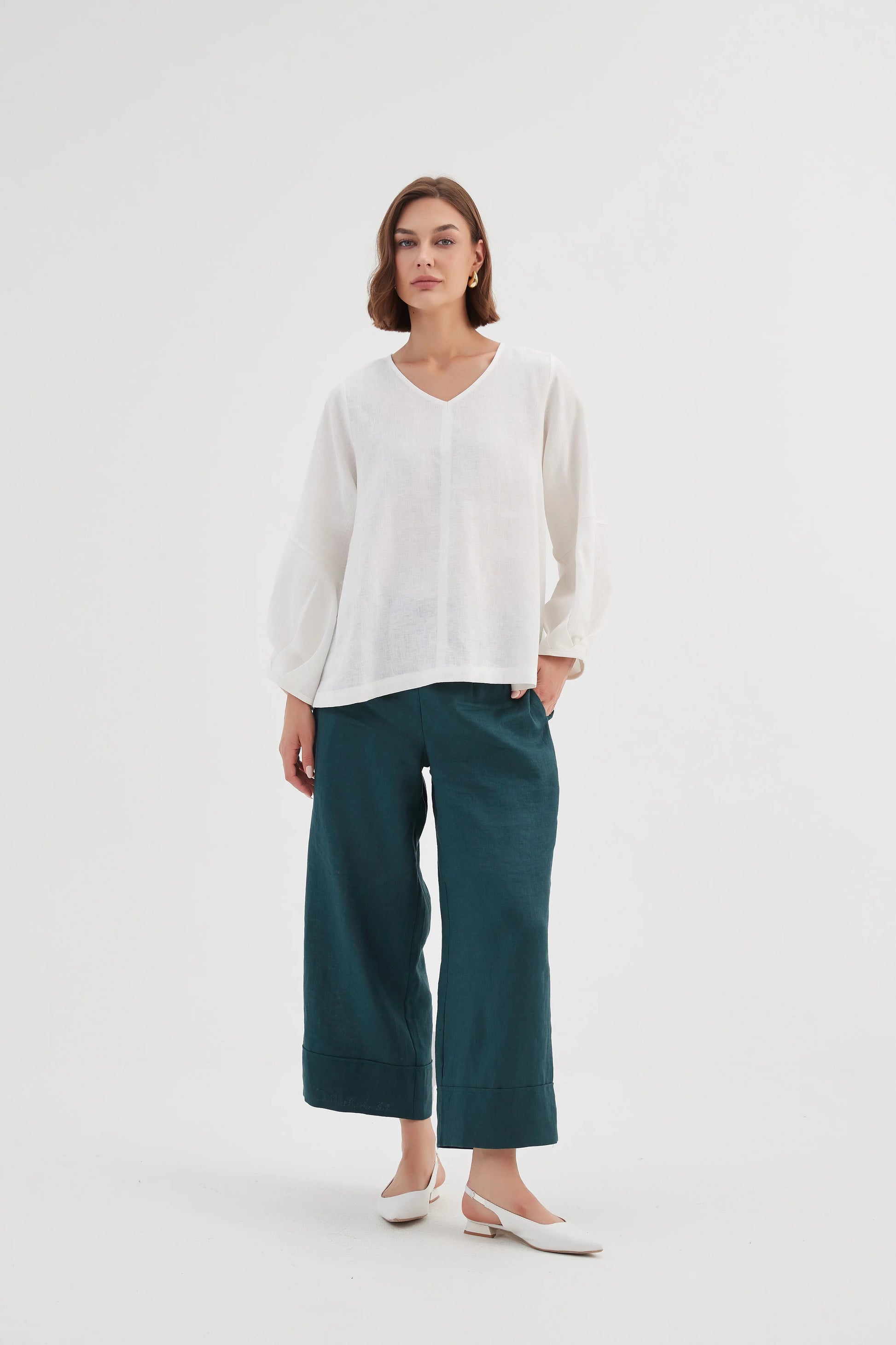 The Bishop Long Sleeve Linen Top offers an effortless elegance with its relaxed silhouette and timeless design. Featuring a flattering V-neckline and beautifully crafted bishop sleeves, this top adds a touch of sophistication to any look. The pleated cuff detail brings subtle refinement, making it perfect for both casual and elevated styling.