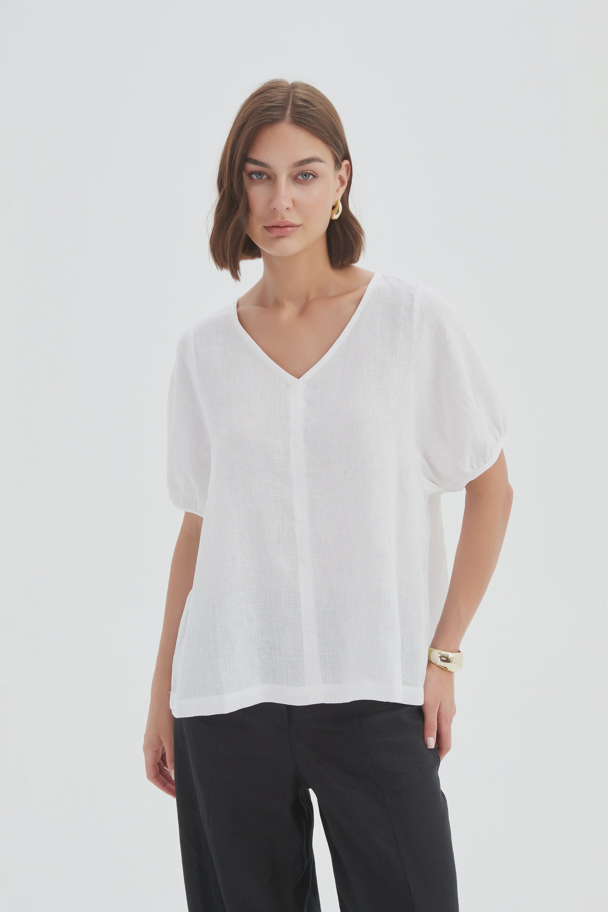 Elevate your casual wardrobe with our Bishop Sleeve Tee. Crafted from 100% French Linen, this versatile piece features a flattering v-neck and relaxed silhouette, complemented by the graceful puff of bishop sleeves. Perfect for effortless styling, whether you're dressing up or down.