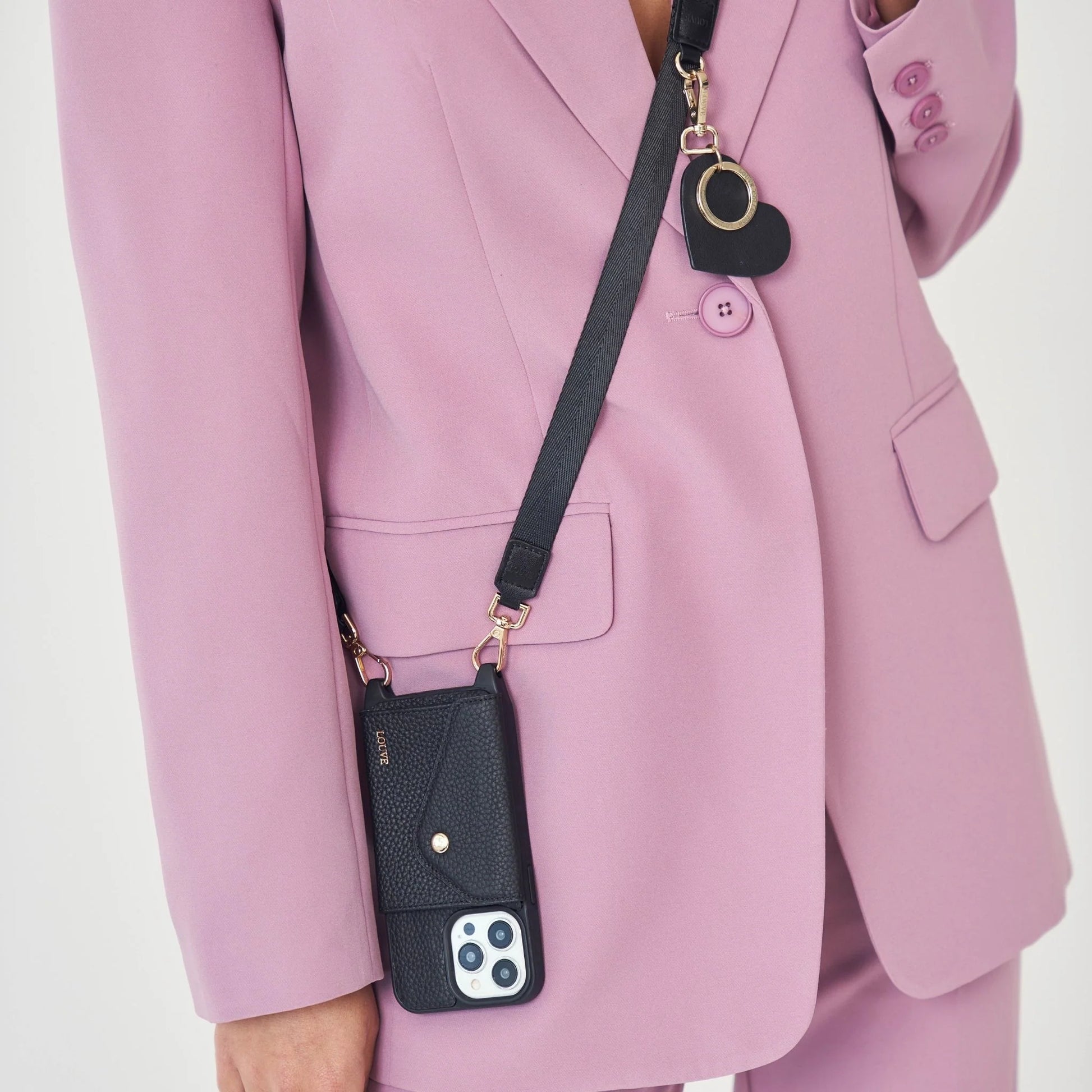 Indulge in timeless elegance with the Black Leather Heart-Shaped Key Chain. Meticulously crafted from genuine smooth leather, this exquisite piece embodies sophistication and style. Its sleek and compact design effortlessly attaches to one of our phone straps or chains, allowing you to keep even more essentials by your side while remaining hands-free. The lustrous black leather key ring exudes opulence, while the heart-shaped silhouette adds a touch of romantic allure to your everyday essentials. Embrace luxury with every touch and carry your keys with an air of refined grace.