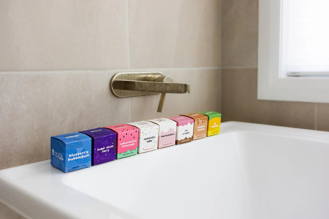 Meet our NEW Blueberry Bubblegum cube bath bomb.