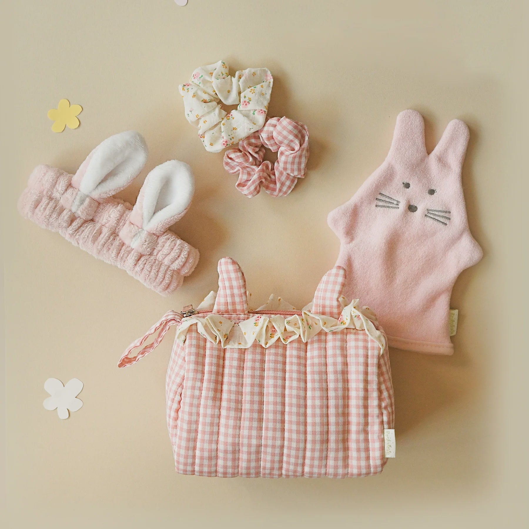 Where bedtime meets bunny magic! Our sleepover set will add a touch of bunny magic to any overnight adventure. This adorable wash bag is made from our soft pink gingham fabric and has a sweet ruffle trim and a wrist handle. Inside you will find a bunny shaped wash mitt, a spa headband and two matching scrunchies! The must have sleepover essential for little ones!