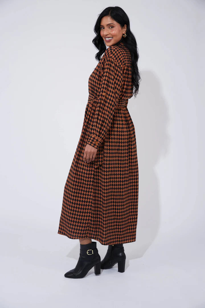 Our Casablanca Dress reimagines a timeless classic with a contemporary flair. Perfect for the office or a romantic evening out, this dress features a tailored bodice cinched with a self-fabric belt, flowing gracefully into an ankle-length skirt. The striking checkered pattern draws the eye, making it a versatile choice to complement with understated accessories and neutral boots.