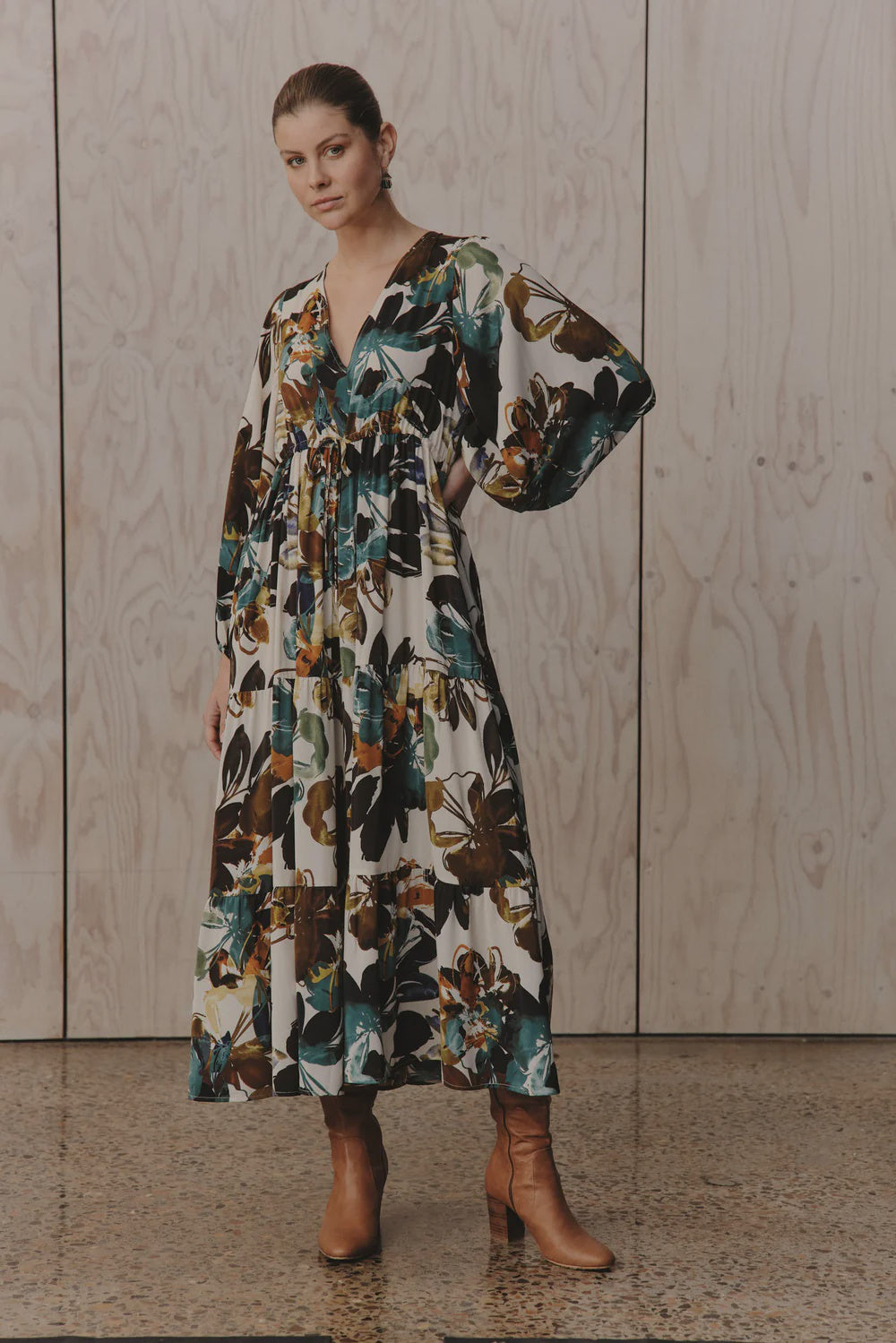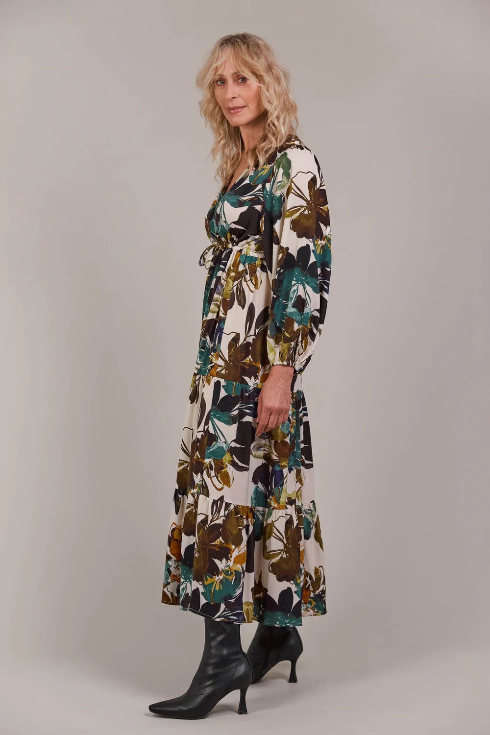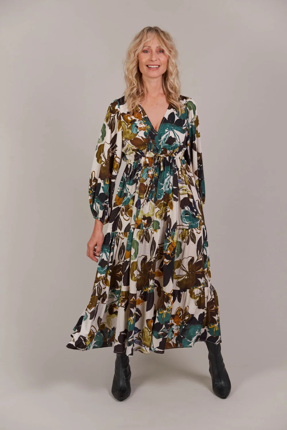 The Elsie Maxi Dress is the ultimate expression of effortless sophistication. Its flattering V-neck flows seamlessly down to an adjustable drawstring, designed to enhance and define your figure. The tiered design creates a lovely sense of movement, finishing at an elegant ankle length. Styled with eye-catching accessories and coordinating boots or heels, the Elsie Maxi Dress is perfect for a romantic evening out.