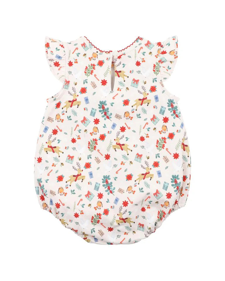 Get into the Christmas spirit with this gorgeous festive print sleeveless bodysuit featuring armhole frills, contrast picot neck trim, elasticated leg openings, a back neck button opening and a concealed press stud crotch opening for ease of dressing.