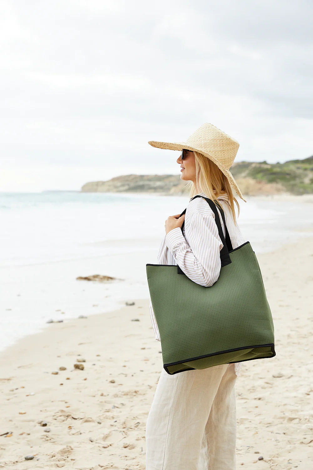 The nylon handle is long enough to throw over a shoulder and comfortable enough to carry all day. An inside pouch keeps keys, sunnies and phone contained. Lightweight, soft, yet incredibly durable. Looks good too.