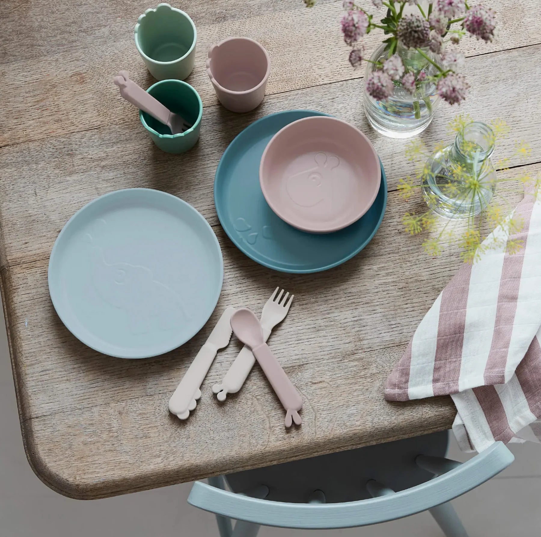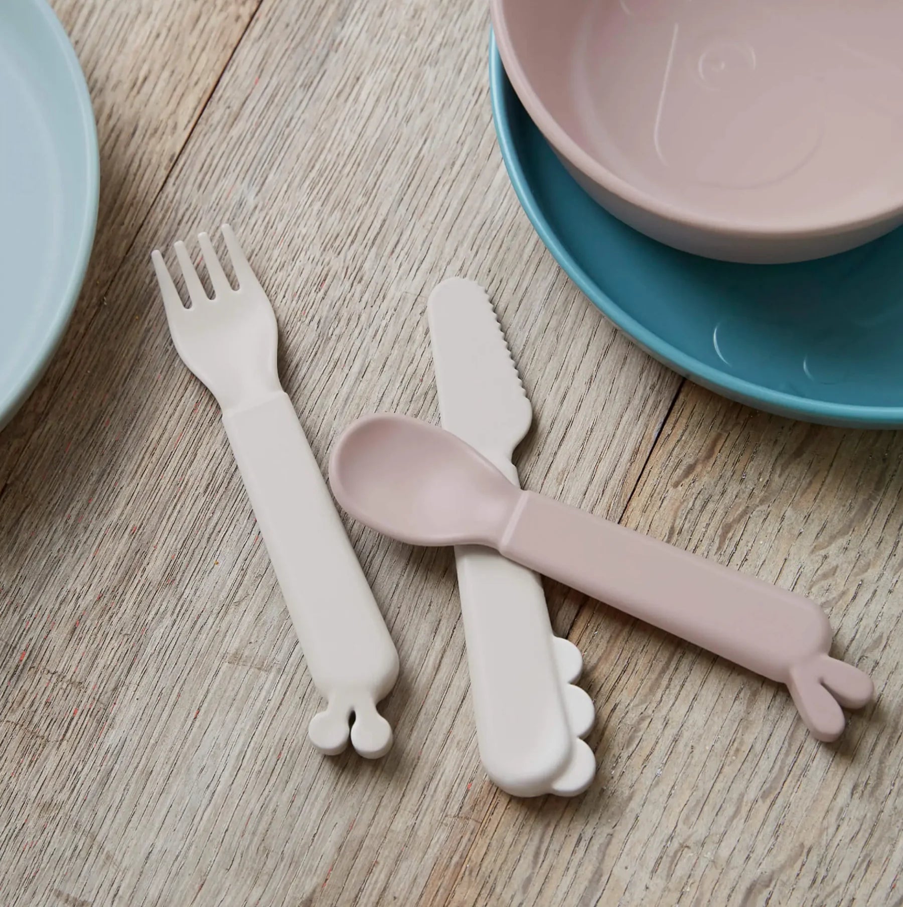 The Kiddish cutlery set with Deer friends has rounded shapes for toddlers to safely practice eating on their own. The cutlery is well dimensioned for little hands and thoroughly tested by kids.