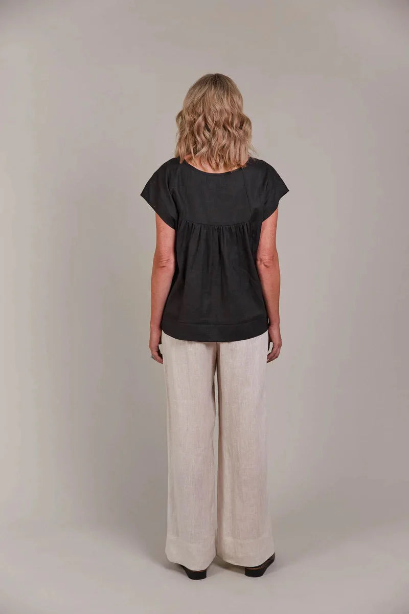 In a classic silhouette, the Laax Top serves as an essential piece for any wardrobe throughout the year. Crafted from a blend of linen and cotton, it ensures breathability and comfort for enduring wear. Its laid-back fit features a round neck, short sleeves, and a high-low hem, creating an effortlessly chic look. A lovely gathered detail at the back adds a special touch that sets it apart from typical tops. This versatile style can be paired with shorts and sneakers on sunny days or layered with a cardigan and scarf over your go-to denim when the weather cools.