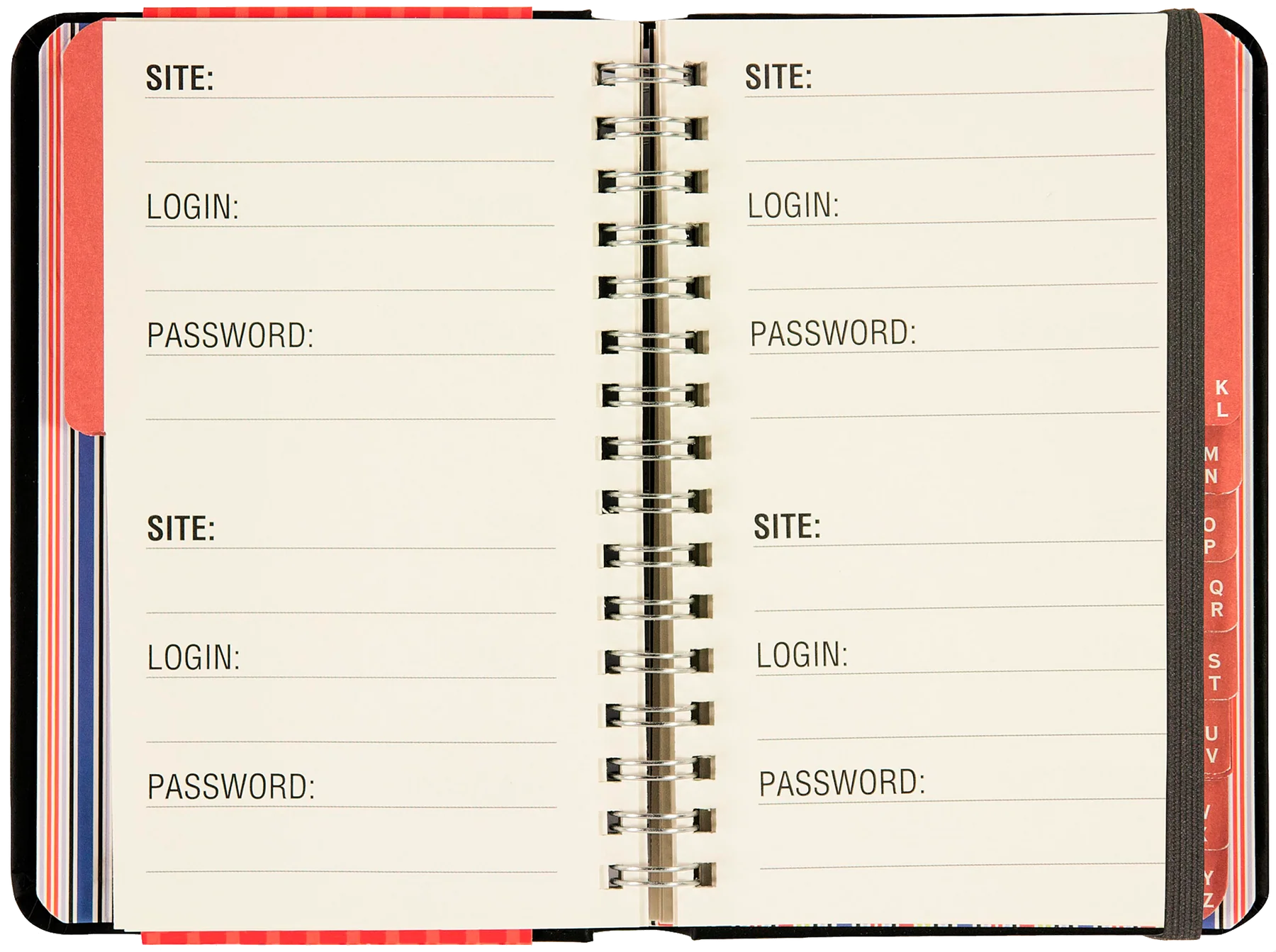 Time- and headache-saving little volume is organized with tabbed A to Z pages, with space on each page to write down websites, usernames, passwords, and extra notes.