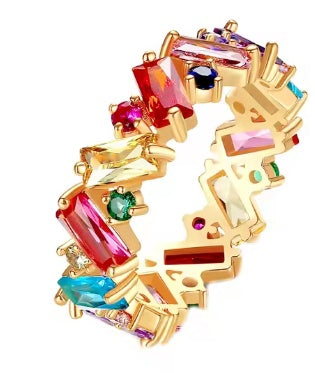 Add a pop of brilliance to your jewelry collection with our Oval Baguette ring, featuring dazzling baguette-cut stones in a vibrant array of hues. Designed to catch the light beautifully, this ring blends classic sophistication with a contemporary, colorful flair.