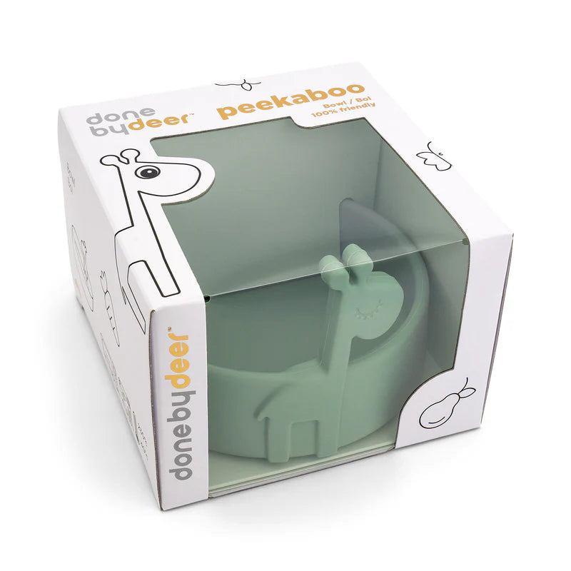 Little ones will enjoy having the sweet giraffe join them for mealtime - and watch out, long necks are perfect for stealing a bite. The practical bowl is in a soft green matching the Peekaboo tableware collection and comes in a cutely decorated gift box.