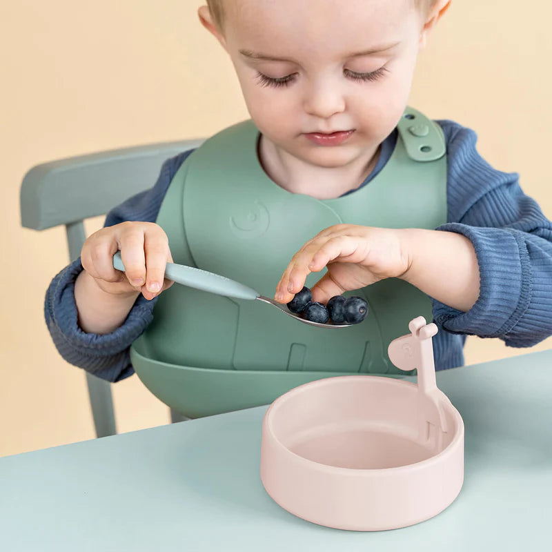Peekaboo it's time to eat! Raffi peeks out from the cute and practical silicone bowl ready to make mealtime an extra fun time of the day. With a great height and rounded inside edges, the bowl is ideal for easy scooping when learning to self-feed.