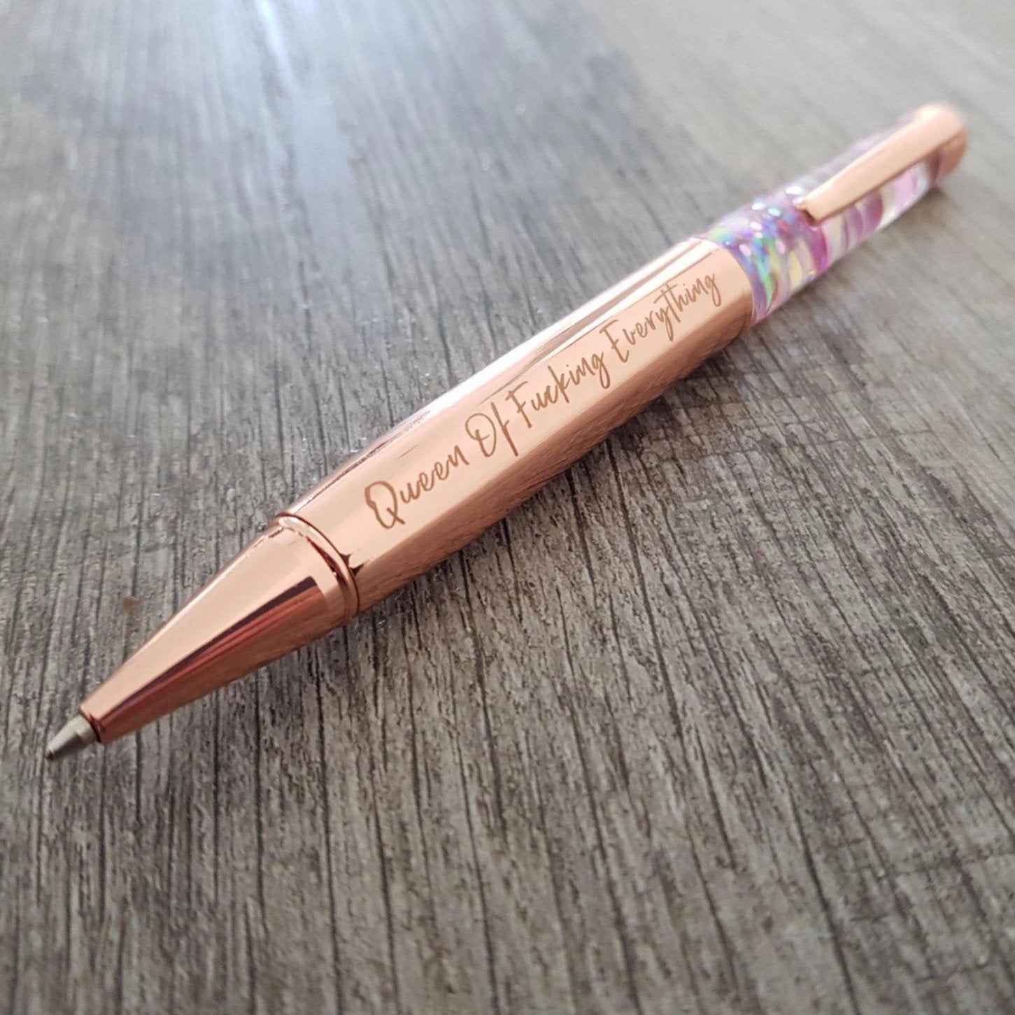 Black Ink Great Gift Laser engraved with the words Queen Of Fucking Everything. Discrete enough for the office Comes presented in a black velvet pouch.