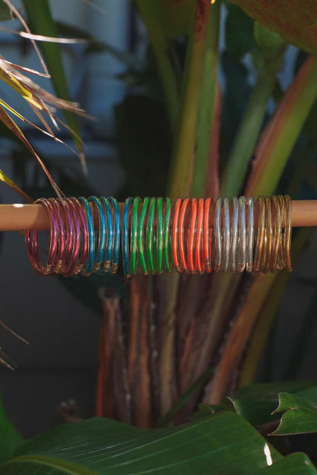 Brighten your look with the Rio Bangle Set! This fun and vibrant set of five bangles is perfect for adding a pop of colour to your look. The contrasting colours and metal accents make this set really stand out, so you can rock your style with confidence. Whether you're dressing up for a night out or just accenting your everyday look, these bangles are sure to turn heads. So have some fun and mix and match them however you like - the only limit is your imagination!