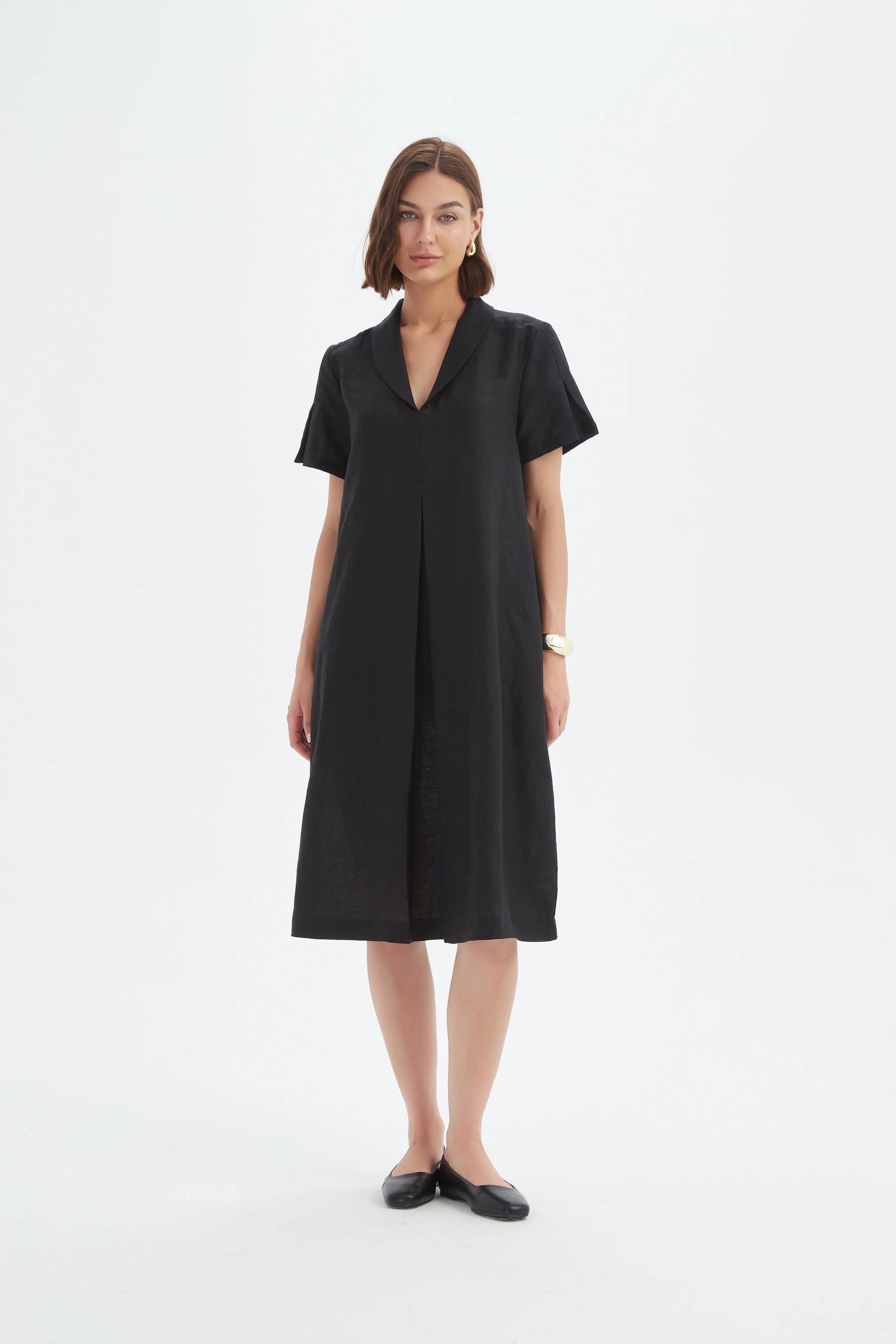 The Shawl Collar Pleat Dress is a timeless addition to your wardrobe, crafted from 100% French Linen for effortless comfort and breathability. Featuring a shawl collar, short sleeves, and inverted pleats on the front and sleeves, this elegant midi dress offers a relaxed yet refined silhouette.
