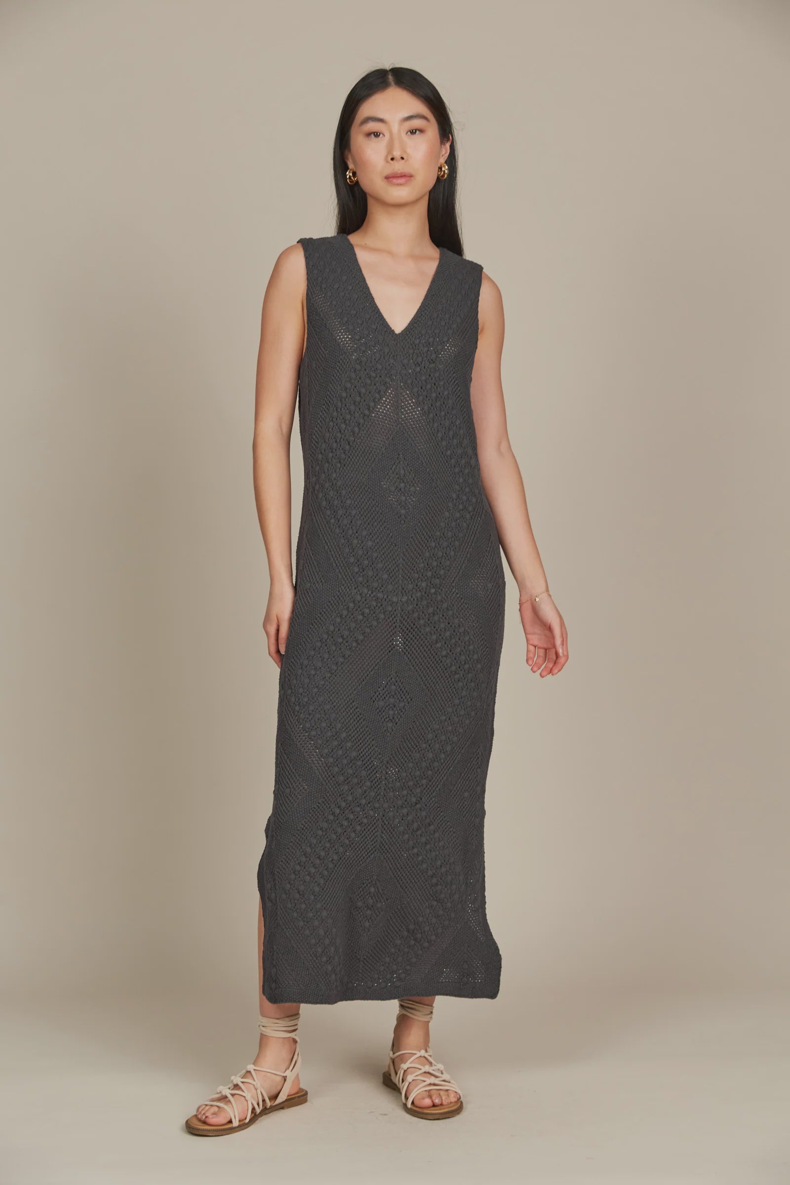 Savour the magic of summer nights while dressed in the Sylvie Dress. This knit dress features a vintage-inspired weave, made from a comfy cotton blend, that exudes charm with its semi-fitted silhouette. Falling elegantly to a midi length, it showcases a flattering V-neck, wide shoulder straps, and high side vents. Whether it's a wine tasting or a casual gathering, complete your look with strappy sandals and minimalistic accessories.