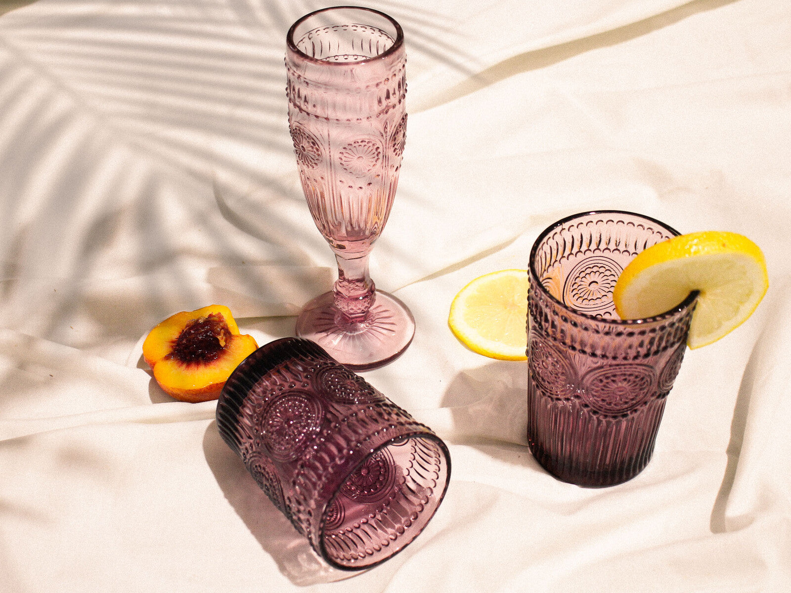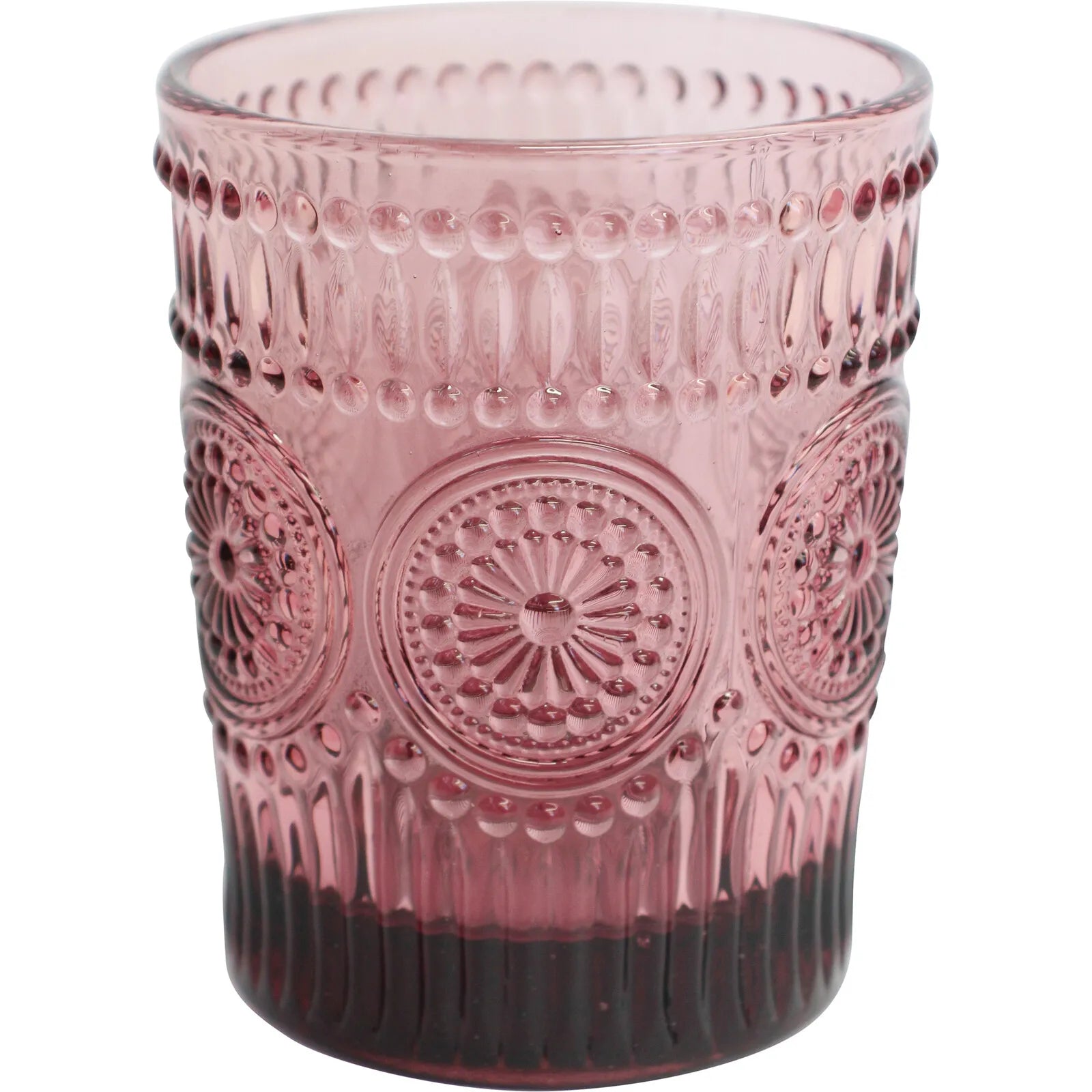 The tint of pink makes the look of this glass fell delicate although the manner in which it has been built is sturdy and well balanced. A glass with a ribbed design as well as a motif adorning its textured outer body - this is a great addition for your collection of serveware especially suited to serving juices and the likes.