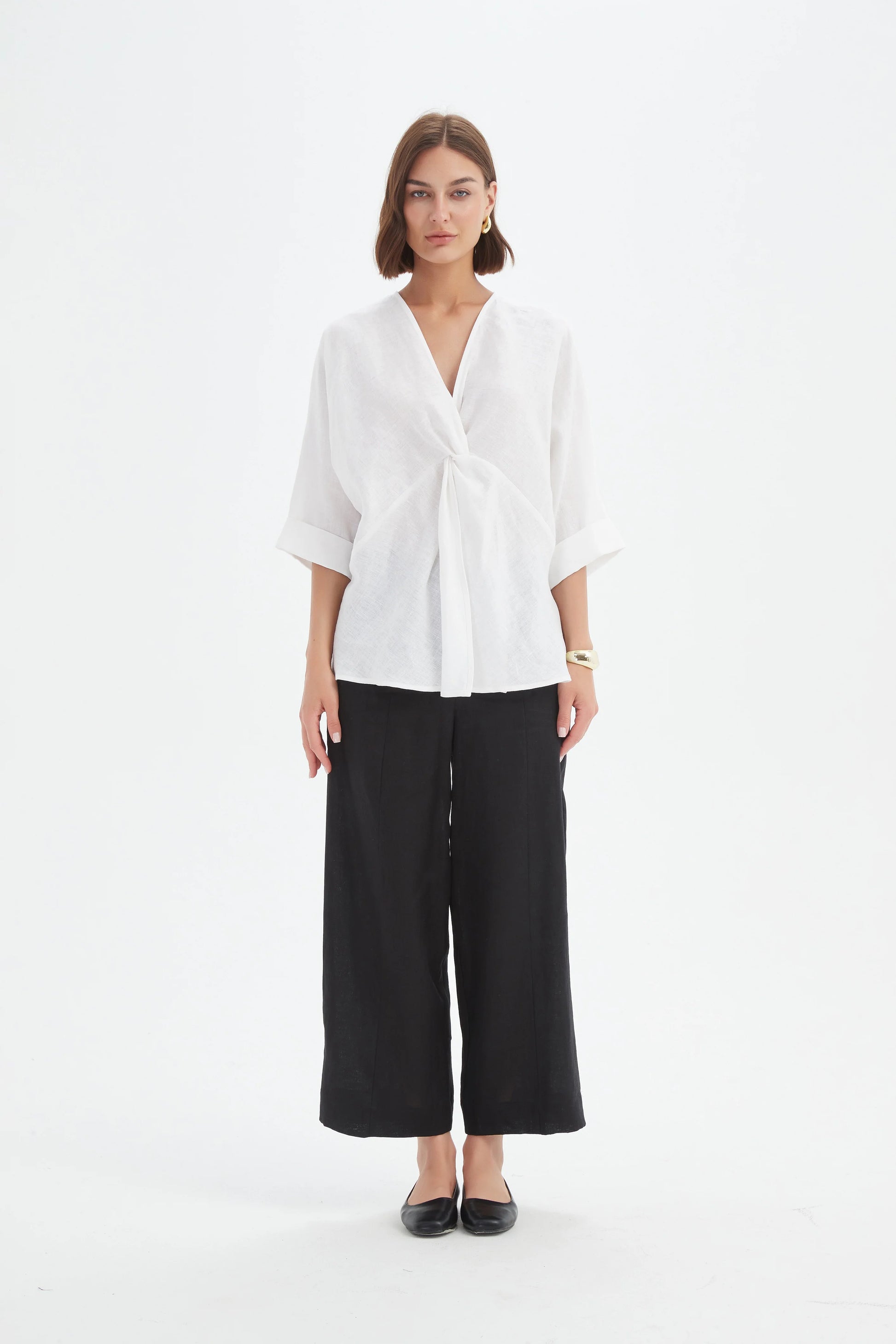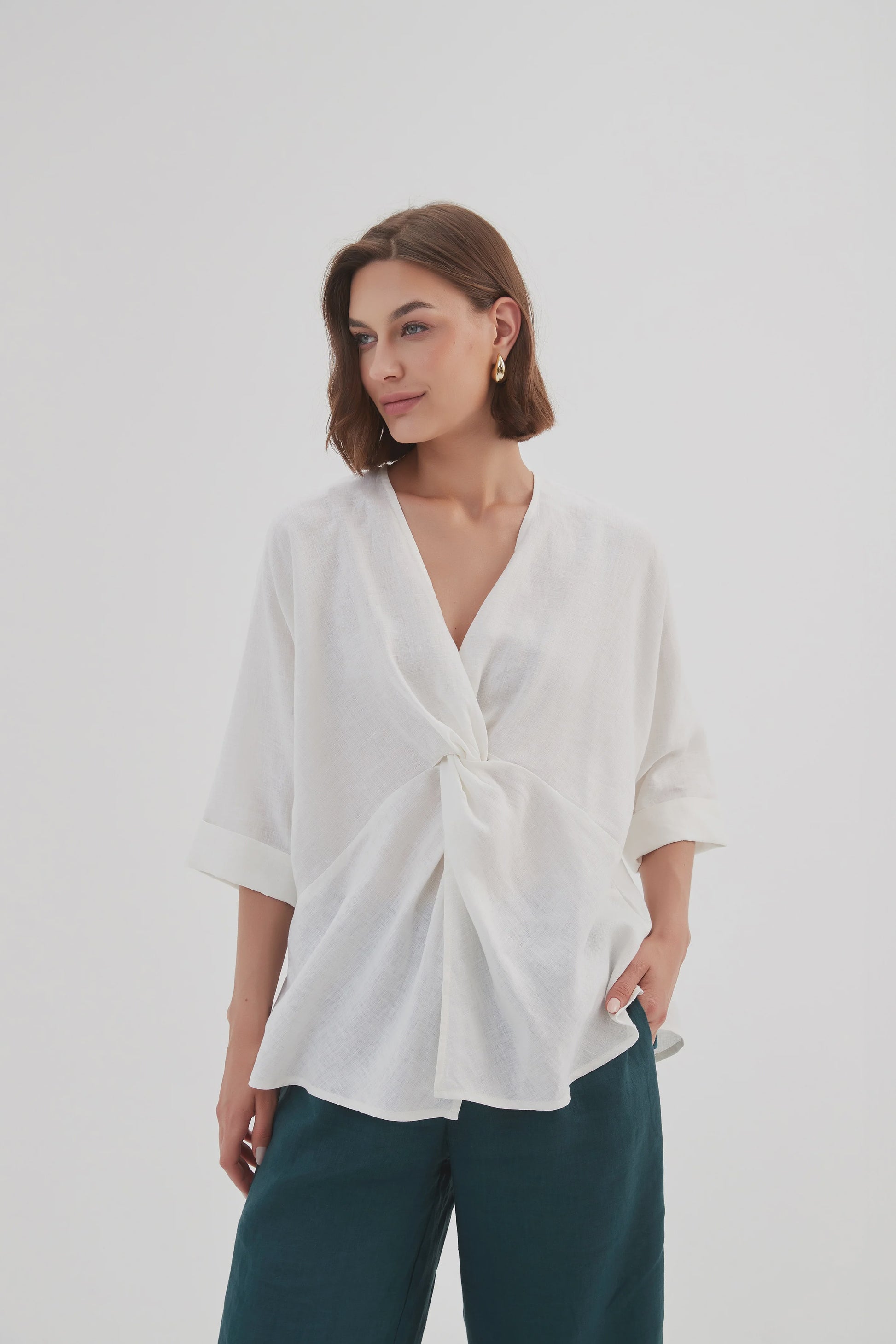 Unique, elevated, and chic. The Twist Front Top is crafted from 100% French Linen and features a twist front detail, v neck, and 3/4 sleeves. Elevate your look effortlessly with this captivating top.