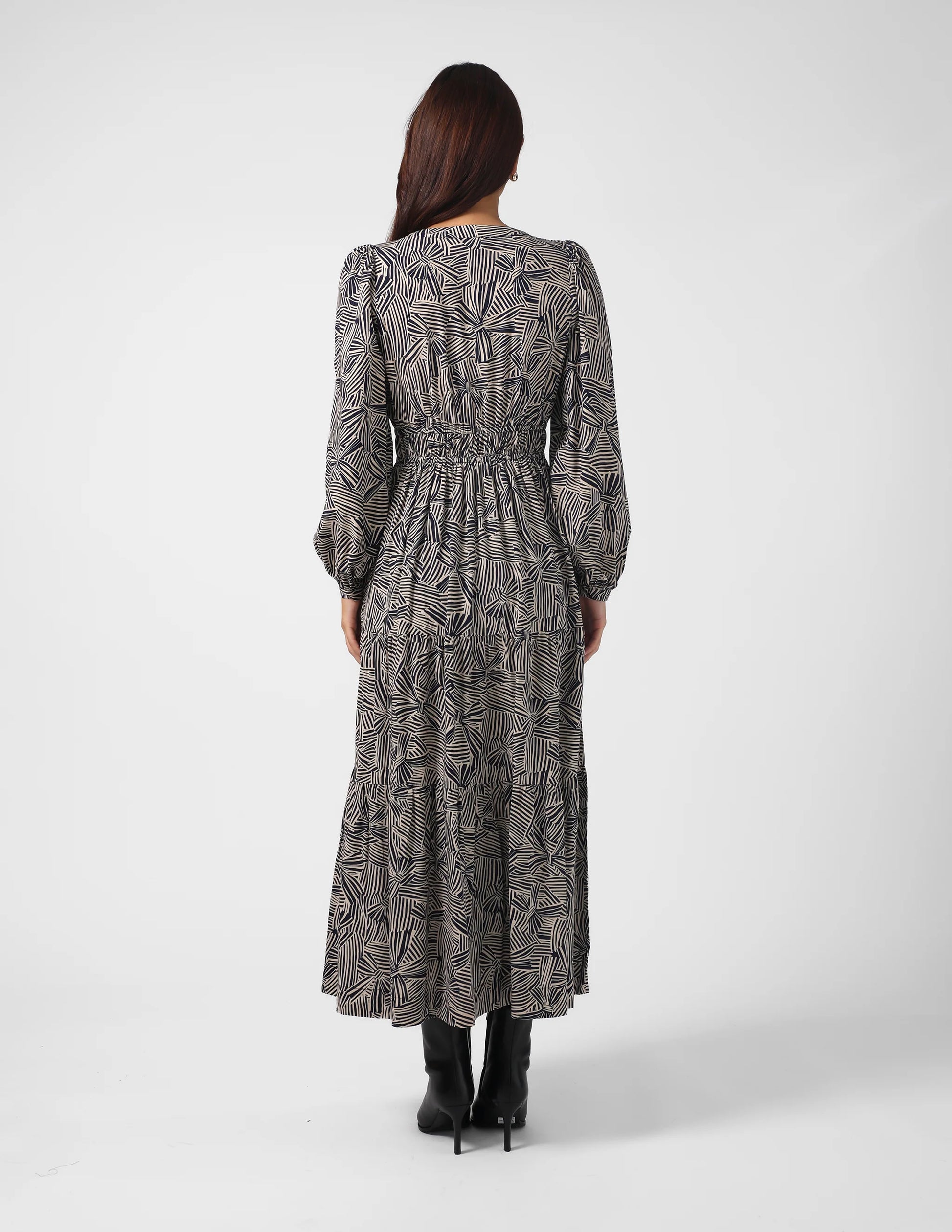 Tiered maxi dress with v neck and elasticated waist detail. Gathered sleeve head down to gathered cuff.